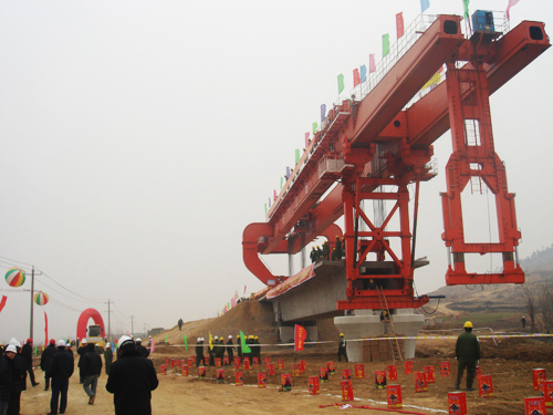 以及生產(chǎn)更新運架產(chǎn)品能架設跨度40M高速鐵路箱梁的:SXJ1000T/40M一跨式架橋機(配套攀爬式運梁車可以實現(xiàn)過隧道零距離架梁)和攀爬式運梁車。并能對現(xiàn)有32M分體式運架設備進行改造,改造后能實現(xiàn)高低位架設跨度40M高速鐵路箱梁(高位改造不能過隧道,把原架橋機改造一跨式,把原運梁車增加2軸。低位改造能過隧道架梁,把原架橋機改造一跨式低位,把原運梁車改成攀爬式運梁車并增加二臺喂梁臺車實現(xiàn)過隧道架梁)。